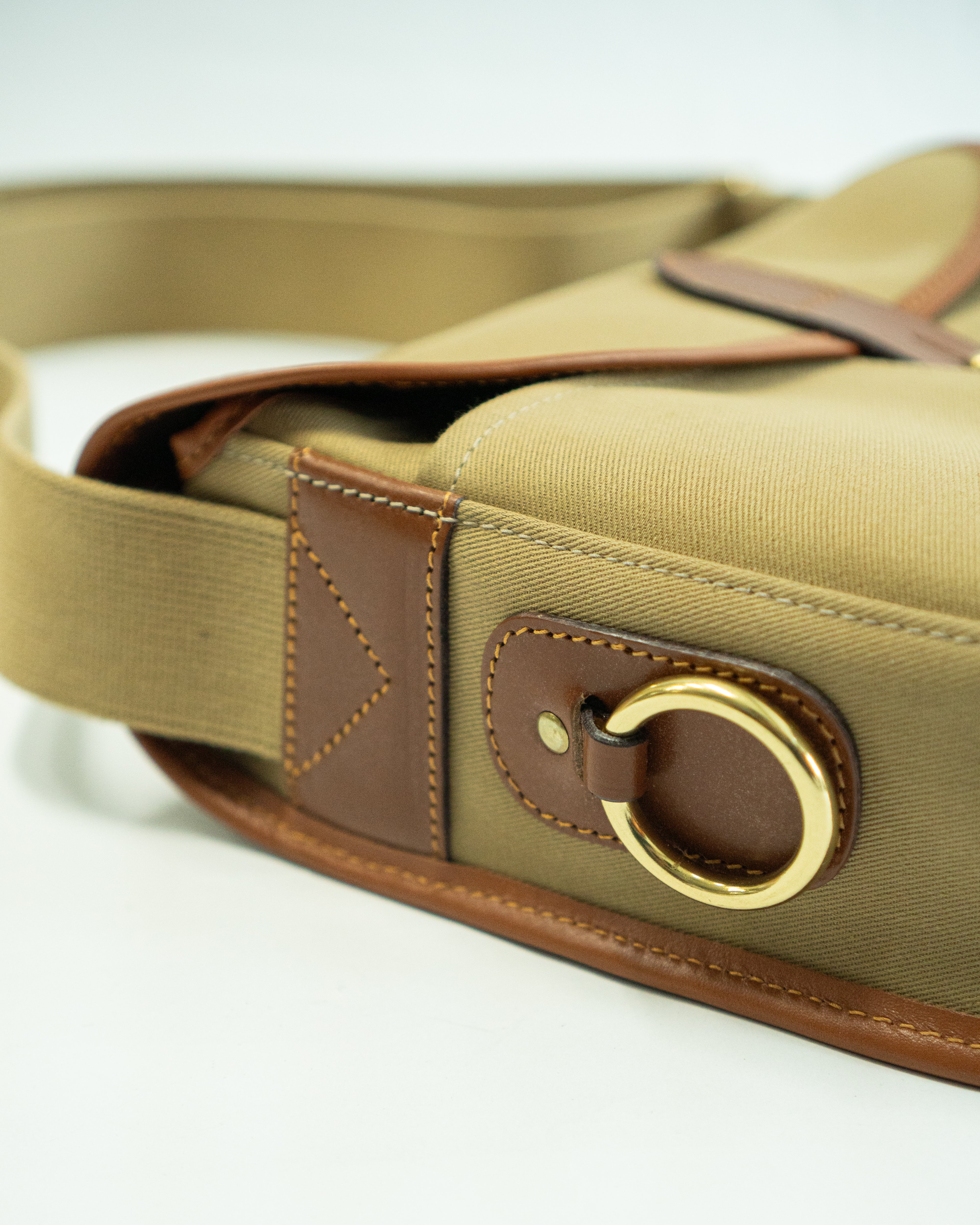 It features double fronted pleat pockets, a bridle leather strap and stud fastening and an adjustable webbing shoulder strap.