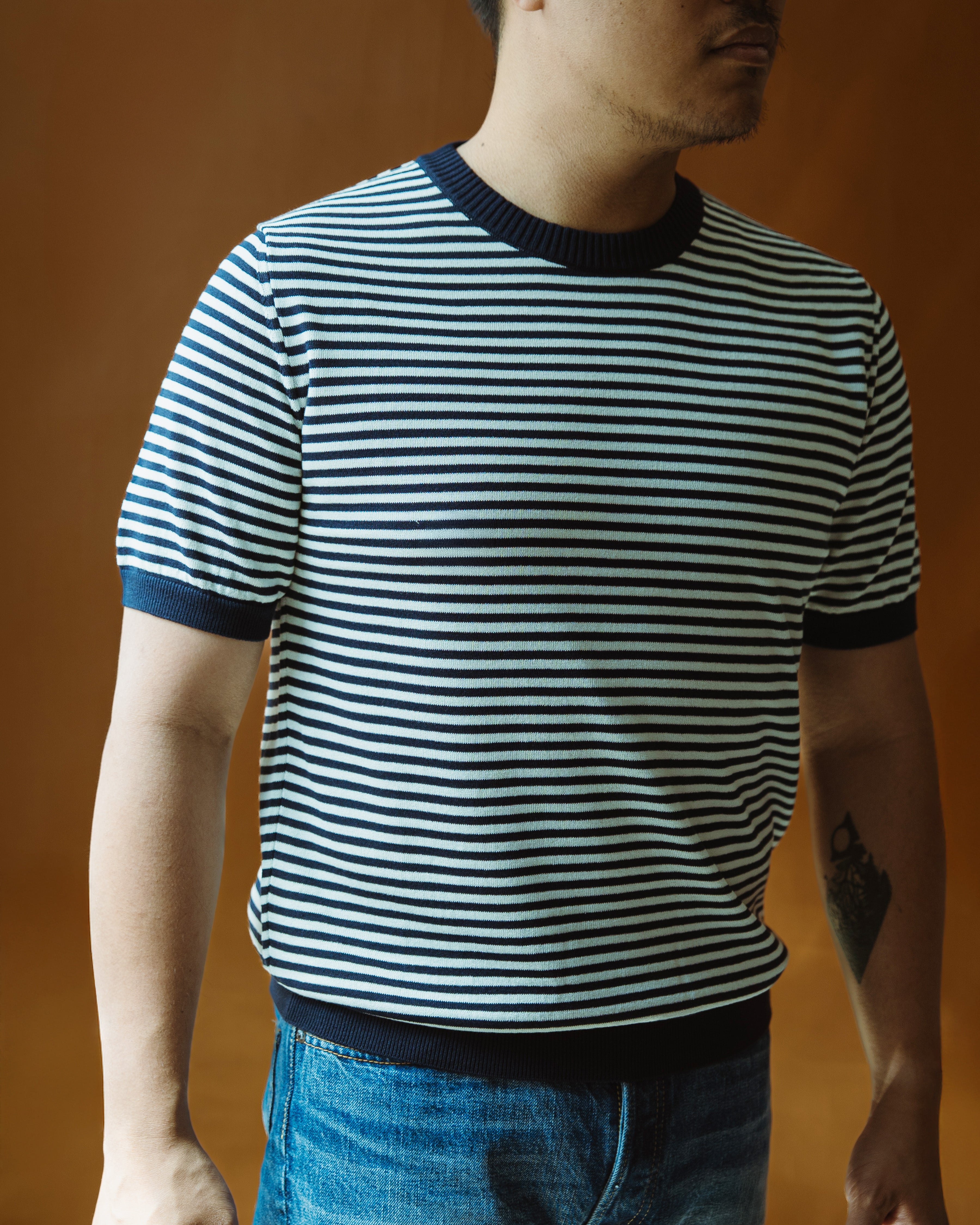 Ice Cotton Border Crew Neck IC4 | Navy-Off White