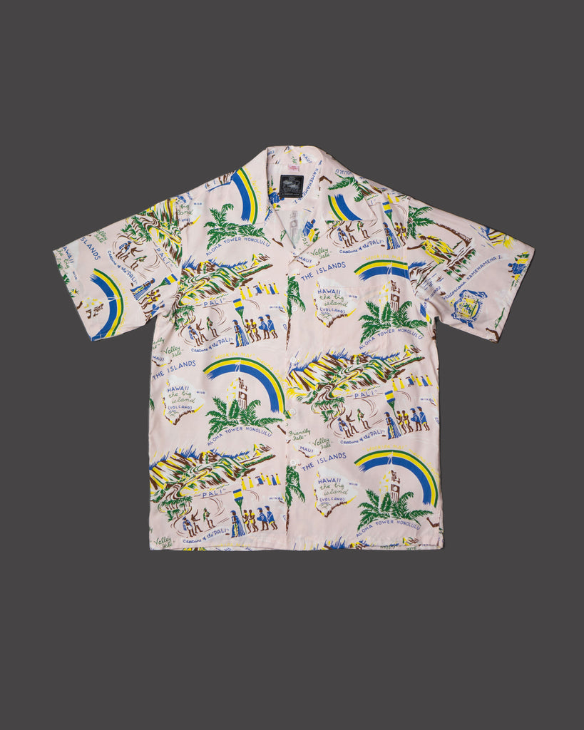 This pattern features iconic Hawaiian landmarks and the seal of Kamehameha, the first ruler of the kingdom of Hawaii. Available in powder blue and pale pink.