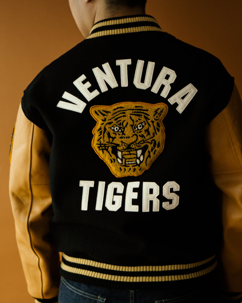 Fresh from the bleachers and into the field, this stadium jacket from the 50s dons the Ventura Tigers pride on its 100% melton wool fabric, complete in brand with sporty chenille appliqués and collegiate striped trims.